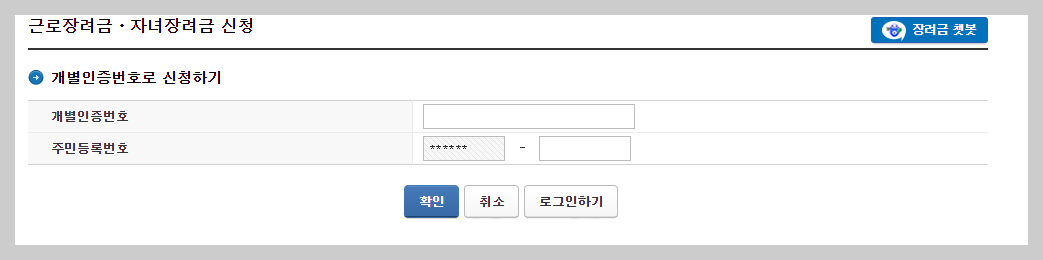 근로. 장려금 신청하기 버튼을 누르면