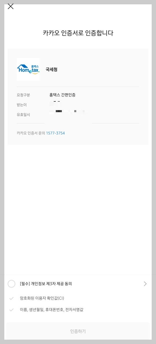 본인 카카오톡으로 인증요청 안내 메시지가 도착하는데