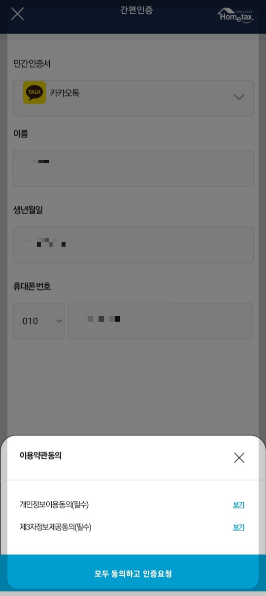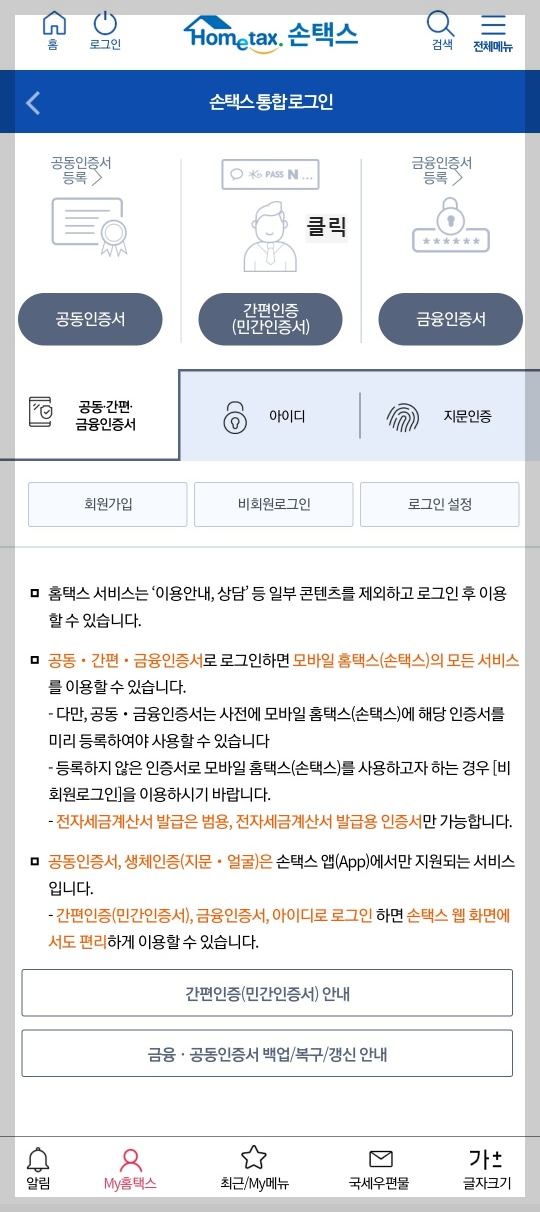 핸드폰을 이용한 손택스 간편 로그인