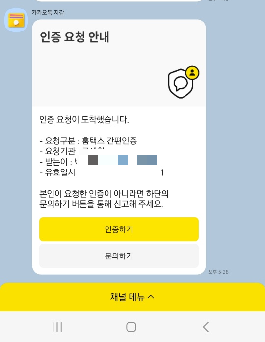 카카오톡으로 인증요청안내 메시지가 오게 되고